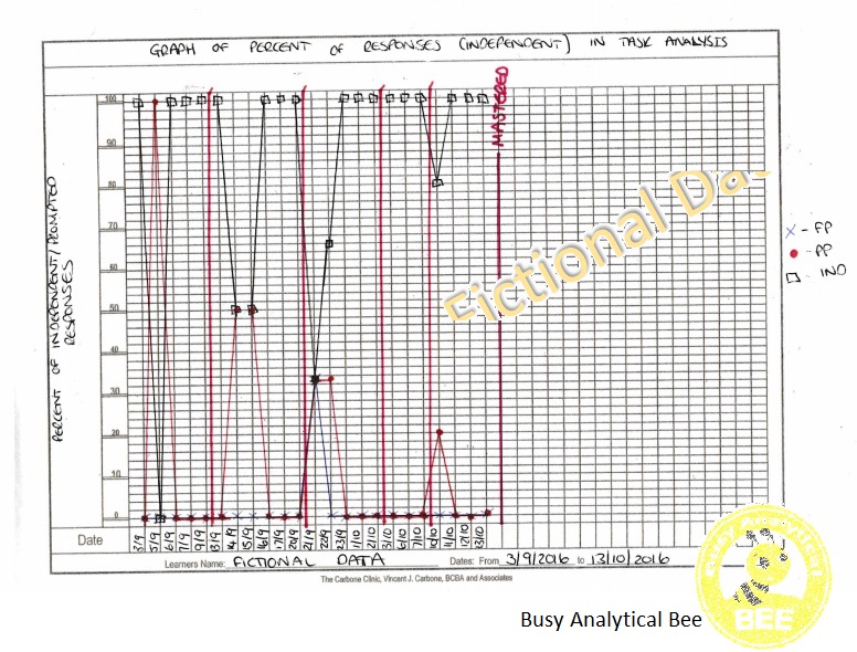 During every trial the client is expected to complete every step, and the level of prompting differs for each step. In the first session, on the first step a full physical prompt is required, but on the fourth step the client is able to do it independently. Here is how I graphed the fictional data for this total task chaining: