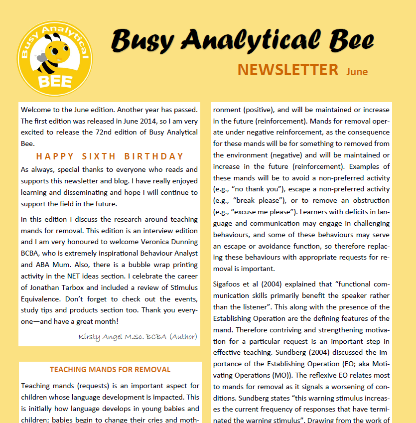 This edition reviews Manding for removal and the research around this. This is also an interview edition, and I am so excited and honoured to welcome Veronica ‘Roni’ Dunning BCBA. Who is a truly inspiration Behaviour Analyst and ABA Mum! In addition I explain Stimulus Equivalence in the terminology section, and a bubble wrap printing activity in the NET section. I celebrate the career of Jonathan Tarbox. Also check out the products, study tips and events section.
